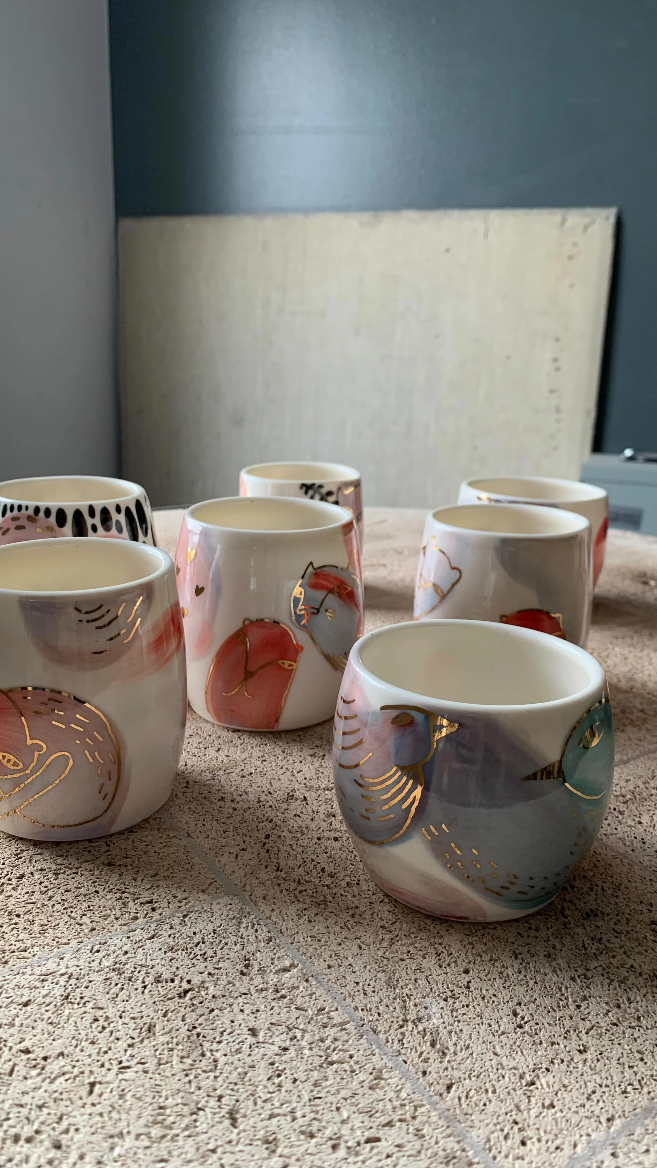 Sarah is a ceramic artist living on Vancouver Island. She loves clay and designing pieces that tell stories. Each of her cups is thrown from porcelain on the wheel, and hand-painted with black slip. The fine line details of the characters and creatures are made by carving through the black to the porcelain underneath. While Sarah repeats many of her characters, each piece is individually painted and is unique. She is curious to know what is even going on for each of these characters that come from her brush.